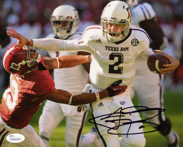 Johnny Manziel, former Heisman Trophy winning quarterback for the Texas A&M Aggies, has hand signed this 8x10 photo at a private signing. This item comes with a certificate of authenticity (COA) from JSA - James Spence Authentication and was signed in the presence of one of their representatives. You will receive a serial-numbered COA along with a matching serial-numbered sticker on the photo. The authenticity can be verified online by entering the serial number.Item pictured may not be the exact item you will receive. It will be similar quality, and we guarantee your satisfaction.