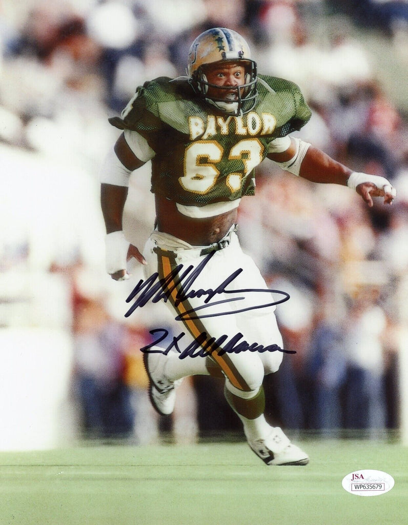 Mike Singletary, former All-American linebacker for the Baylor Bears, has hand signed this 8x10 photo at a private signing. He included the inscription "2x All-American". This item comes with a certificate of authenticity (COA) from JSA - James Spence Authentication and was signed in the presence of one of their representatives. You will receive a serial-numbered COA along with a matching serial-numbered sticker on the photo. The authenticity can be verified online by entering the serial number.Item pictured may not be the exact item you will receive. It will be similar quality, and we guarantee your satisfaction.