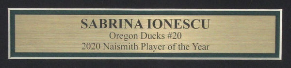 Sabrina Ionescu Autographed/Inscribed "20 Naismith" 8x10 Photo Oregon Ducks Framed. The outer frame size is 13 inches x 16 inches. This photo is authenticated by Fanatics Authentic and includes their Tamper-proof Sticker and Certificate of Authenticity.
