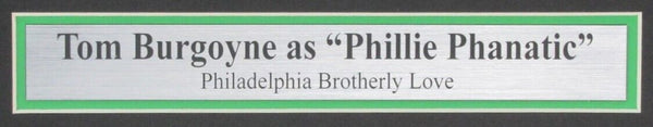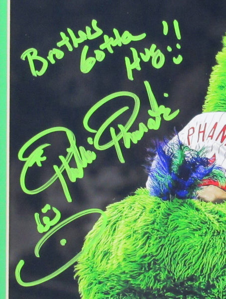Tom Burgoyne "Phillie Phanatic" Signed/Inscribed "Brothers Gotta Hug!" 18x22 Photo with Jason Kelce Framed. The outer frame size is 26 inches x 26 inches. This photo is authenticated by JSA and contains their Tamper-proof Hologram Sticker and Certificate of Authenticity.