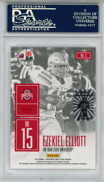 Ezekiel Elliott Signed 2016 Panini Contenders Draft Picks Gameday #5 Card PSA 42676 The number in the listing title is just an inventory sku for our records and is not the authentication number. This is the exact item that you will receive so please see pictures for condition. This is a trading card that was personally autographed by Ezekiel Elliott. This has been professionally slabbed by Professional Sports Authentication (PSA) and includes a certificate of authenticity from Denver Autographs.