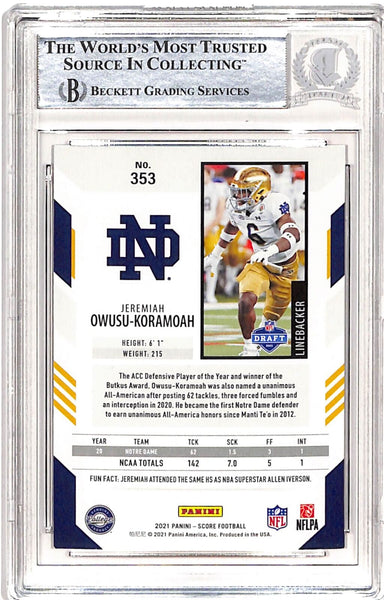 Jeremiah Owusu-Komamoah Signed 2021 Score #353 Beckett 38725 The number in the listing title is just an inventory sku for our records and is not the authentication number. The item pictured is a stock photo unless otherwise noted. This is a slabbed 2021 Score #353 Trading Card that was personally autographed by Jeremiah Owusu-Komamoah. Includes a certificate of authenticity from Beckett Authentication Services (BAS) and Denver Autographs.