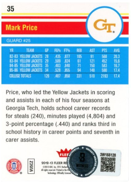 The number in the listing title is just an inventory sku for our records and is not the authentication number. The item pictured is the exact image you will receive, please see photos for condition. This is a Georgia Tech Yellow Jackets 2012-2013 Fleer Retro #35 Trading Card that was personally autographed by Mark Price. Includes a certificate of authenticity from Beckett Authentication Services (BAS) and Denver Autographs. FREE SHIPPING within the USA on orders over $10!