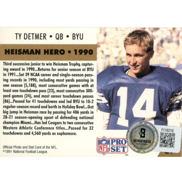 The number in the listing title is just an inventory sku for our records and is not the authentication number. The item pictured is the exact item you will receive, please see photos for condition. This is a Bringham Young University 1991 Pro Set #37 Trading Card that was personally autographed by Ty Detmer. Includes a certificate of authenticity from Beckett Authentication Services (BAS) and Denver Autographs. FREE SHIPPING within the USA on orders over $99!