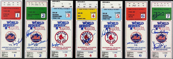 A 1986 New York Mets Unframed 12x24 MLB World Series Ticket Board hand signed by 10 Mets Team Members including Terry Leach, Ed Hearn, Barry Lyons, Tim Teufel, Mookie Wilson & Bud Hud Harrelson. The item and signature are in excellent condition. AUTHENTICATION: The item is accompanied by a JSA Certificate of Authenticity - JSA Serial Numbered and Databased Hologram