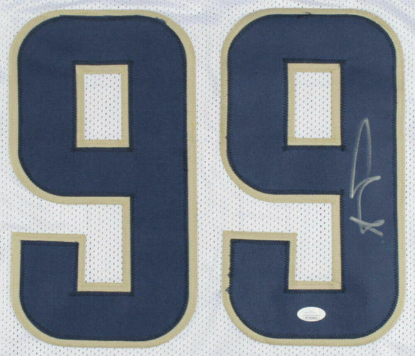 Custom frame measures approximately 35" x 43" in size and features a jersey which has been hand-signed in silver paint pen by Aaron Donald. The lot / autograph(s) includes an official James Spence Authentication (JSA) hologram for authenticity purposes. The signing of this item was witnessed by JSA.Authentication: JSA Hologram