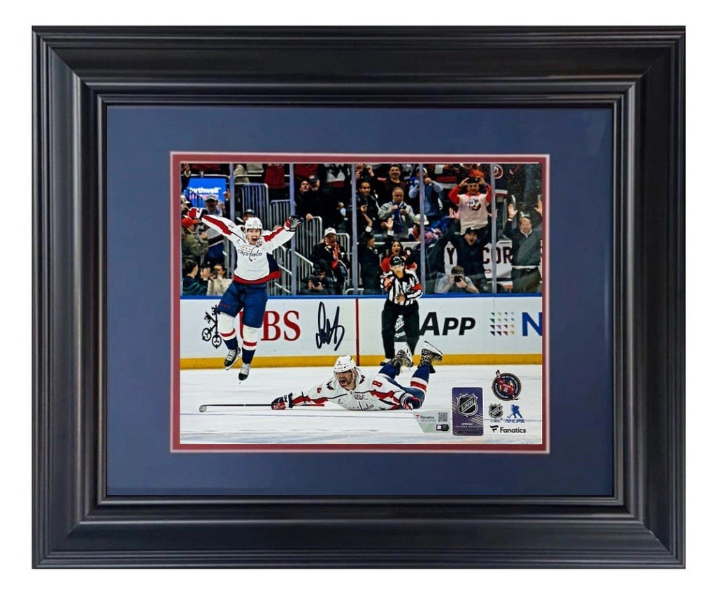 Alexander Ovechkin hand signed 8x10 framed photo. Hand signed by the NHL all time leading goal scorer Alexander Ovechkin in bold black. Great shot of him celebrating after scoring and breaking the record. Framed in black with navy and red colored matting. Final framed dimensions are 17x13... comes ready to hang.