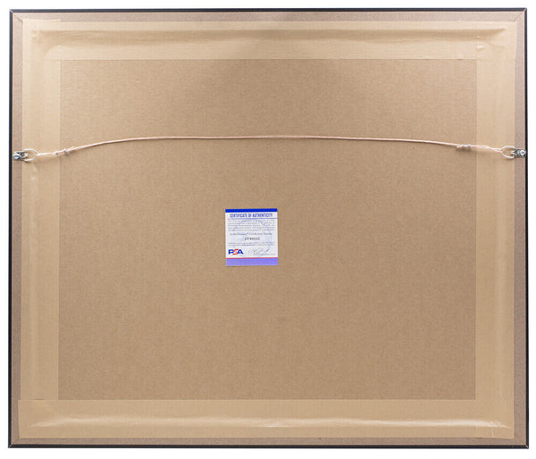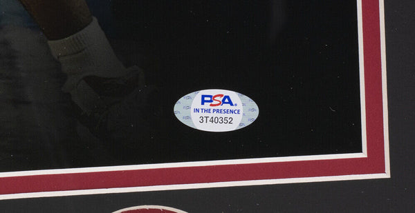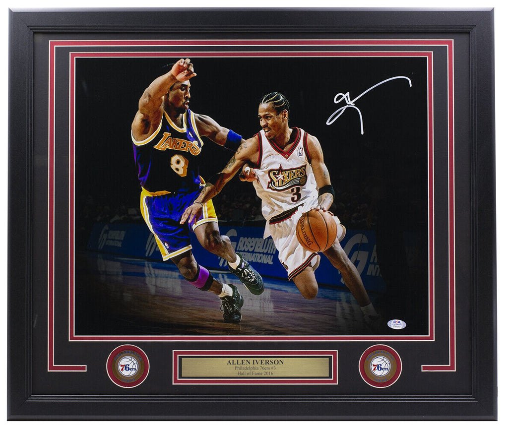 Featured is an Allen Iverson signed framed 16x20 Philadelphia 76ers photo vs Kobe Bryant. This photo was hand signed by Allen Iverson and has been authenticated by PSA authentication services. Included with this photo is a PSA hologram and certificate of authenticity. This photo is professionally framed featuring double matting and an engraved nameplate. The frame measures approximately 20x24 in total size, and it is ready for display. This item would make a great addition to any sports memorabilia collection. SPECIFICATIONS Autographed By: Allen Iverson Team: Philadelphia 76ers Sport: Basketball Authentication: Professional Sports Authenticator (PSA)