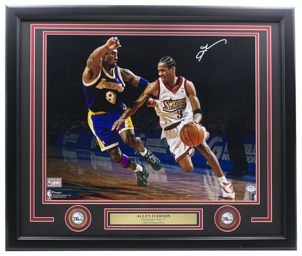 Featured is an Allen Iverson signed framed 16x20 Philadelphia 76ers photo vs Kobe Bryant. This photo was hand signed by Allen Iverson and has been authenticated by PSA authentication services. Included with this photo is a PSA hologram and certificate of authenticity. This photo is professionally framed featuring double matting and an engraved nameplate. The frame measures approximately 20x24 in total size, and it is ready for display. This item would make a great addition to any sports memorabilia collection. SPECIFICATIONS Autographed By: Allen Iverson Team: Philadelphia 76ers Sport: Basketball-NBA Authentication: Professional Sports Authenticator (PSA)