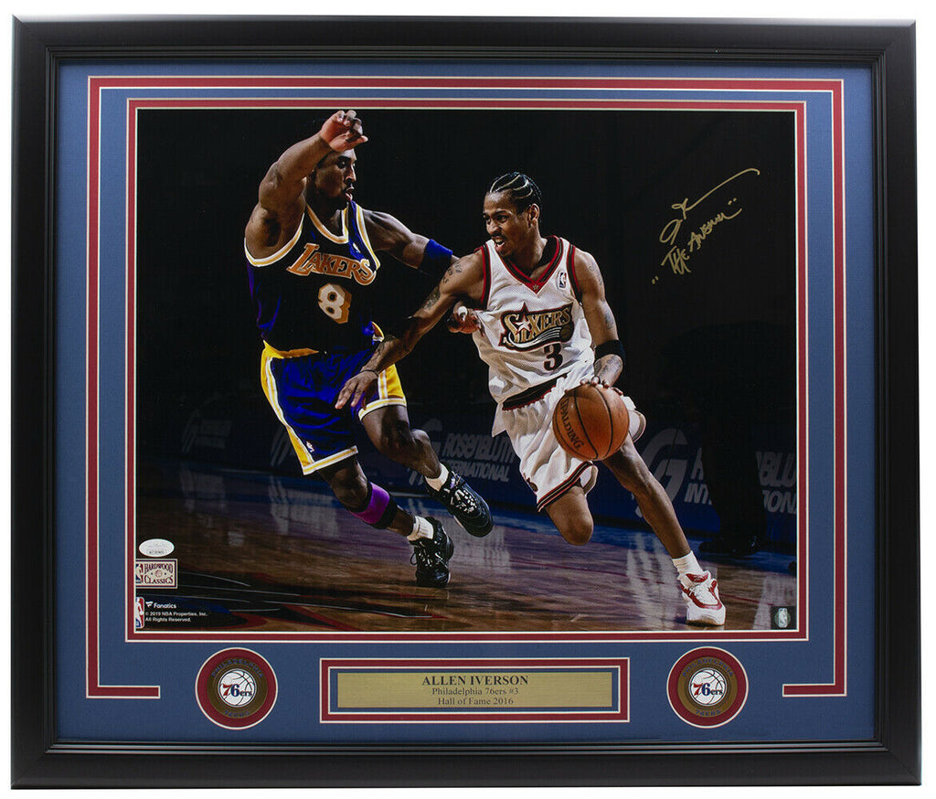 Featured is an Allen Iverson signed framed Philadelphia 76ers 16x20 photo vs. Kobe Bryant, in which he added the "The Answer" inscription. This photo was hand signed by Allen Iverson in the presence of a JSA authentication representative. The photo includes a JSA witnessed hologram and certificate of authenticity. Brand new professional framing featuring double matting, engraved nameplate and two Philadelphia 76ers medallions. The frame measures approximately 22x27 in total size and it is ready for display. This item would make a great addition to any sports memorabilia collection. SPECIFICATIONS Autographed By: Allen Iverson Team: Philadelphia 76ers Sport: Basketball-NBA Authentication: James Spence Authentication (James Spence Authentication (JSA))