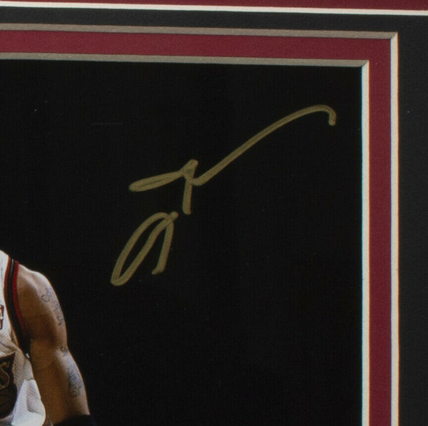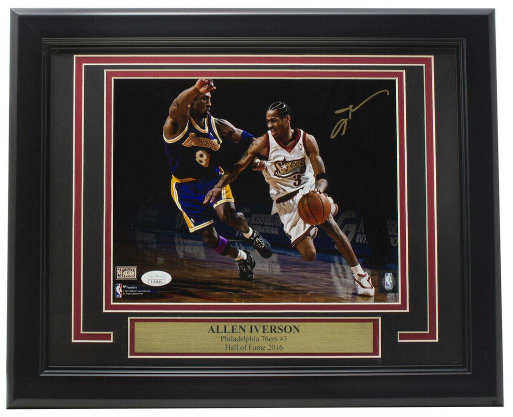 Featured is an Allen Iverson signed framed 8x10 Philadelphia 76ers photo vs Kobe Bryant. This photo was hand signed by Allen Iverson and has been authenticated by JSA authentication services. Included with the photo is a JSA hologram and certificate of authentication. Brand new professional framing featuring double matting and and engraved nameplate. The frame measures approximately 14x11 in total size. The frame is ready to display.. SPECIFICATIONS Autographed By: Allen Iverson Team: Philadelphia 76ers Sport: Basketball-NBA Authentication: James Spence Authentication (JSA)