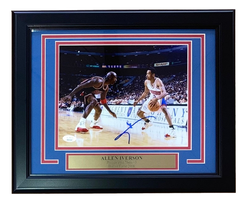 Featured is an Allen Iverson (Philadelphia 76ers) signed 8x10 photo. This photo has been hand signed by Iverson and comes with the JSA witnessed hologram and certificate of authenticity. This photo has been professionally framed and matted and is approximately 11x14. This photo would make a great addition to any sports memorabilia collection!. SPECIFICATIONS Autographed By: Allen Iverson Team: Philadelphia 76ers Sport: Basketball Authentication: James Spence Authentication (JSA)