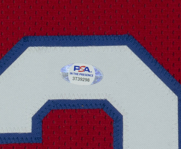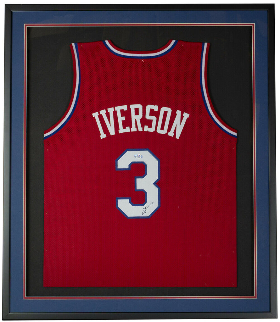 Featured is an Allen Iverson signed framed custom red basketball jersey. This jersey was hand signed by Allen Iverson in the presence of a PSA authentication representative. Included with this jersey is a PSA witnessed hologram and certificate of authentication. This item would make a great addition to any sports memorabilia collection! SPECIFICATIONS Autographed By: Allen Iverson Team: Philadelphia 76ers Sport: Basketball Authentication: Professional Sports Authenticator (PSA)