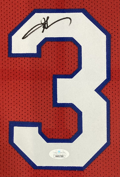 Featured is an Allen Iverson signed custom basketball jersey. This jersey has been hand signed by Iverson and comes with the JSA witnessed hologram and certificate of authenticity. This jersey features professionally sewn letters and numbers and is size XL. This jersey has no team tags or emblems and is intended as a sports collectible. This jersey has been professionally framed and matted and is approximately 32x42. This jersey would make a great addition to any sports memorabilia collection! SPECIFICATIONS Autographed By: Allen Iverson Team: Philadelphia 76ers Sport: Basketball Authentication: James Spence Authentication (JSA)