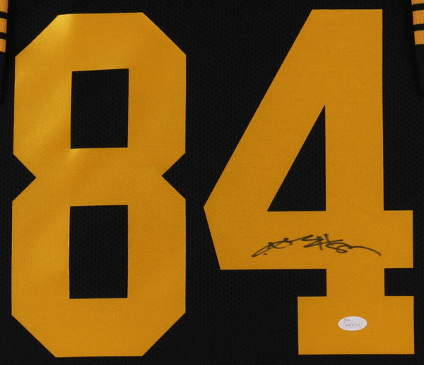 Custom frame measures approximately 35" x 43" in size and features a jersey which has been hand-signed in black felt-tip pen by Antonio Brown. The lot / autograph(s) includes an official James Spence Authentication (JSA) hologram and matching COA for authenticity purposes. The signing of this item was witnessed by JSA.Authentication: JSA COA