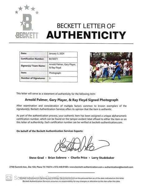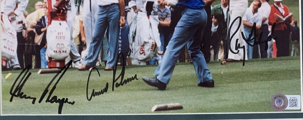 Featured is a Gary Player, Arnold Palmer, and Raymond Floyd signed 8x10 photo. This photo has been hand signed by Player, Palmer and Floyd and comes with the Beckett hologram and letter of authenticity. This photo has been professionally framed and matted and is approximately 11x14. This photo would make a great addition to any sports memorabilia collection! SPECIFICATIONS Autographed By: Team: Sport: Golf-PGA Authentication: Beckett Grading Services