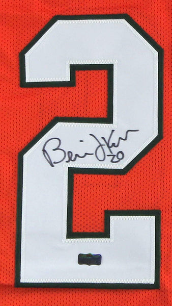 A Miami Large Framed Custom Orange Jersey hand signed by Bernie Kosar. The item and signature are in excellent condition. Bernie is a Super Bowl XXVIII Champion, 2x Pro Bowler, and 1983 National Champion. AUTHENTICATION: The item is accompanied by a Certificate of Authenticity - Serial Numbered and Databased Hologram