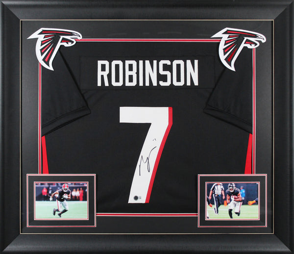 This Autographed Black Pro Style Framed Jersey has been Personally Signed by Bijan Robinson of the Atlanta Falcons. This item is 100% Authentic to include a hologram by Beckett Authentication Services. This item will come with an affixed Beckett Authentication Services (BAS) authentication sticker, which includes a scannable QR code to verify authenticity. Please note that Beckett no longer provides serial-numbered COA cards, and the attached BAS sticker will serve as the complete authentication for this item. This is a BAS Witnessed Protection Program item which means a Beckett Authentication Service representative was present when this item was being signed. We have multiples of this same item. While the photographs are representative of this item, the size, placement and strength of the signature may vary. Each item is hand signed, therefore, each autograph is unique. This item has been professionally framed to overall dimensions of approximately 32 x 37 inches. This is a X-Large sized, non-branded, custom-stitched Framed Jersey. This jersey will be framed to order, it will take approximately 3-4 days from purchase date for it to ship.