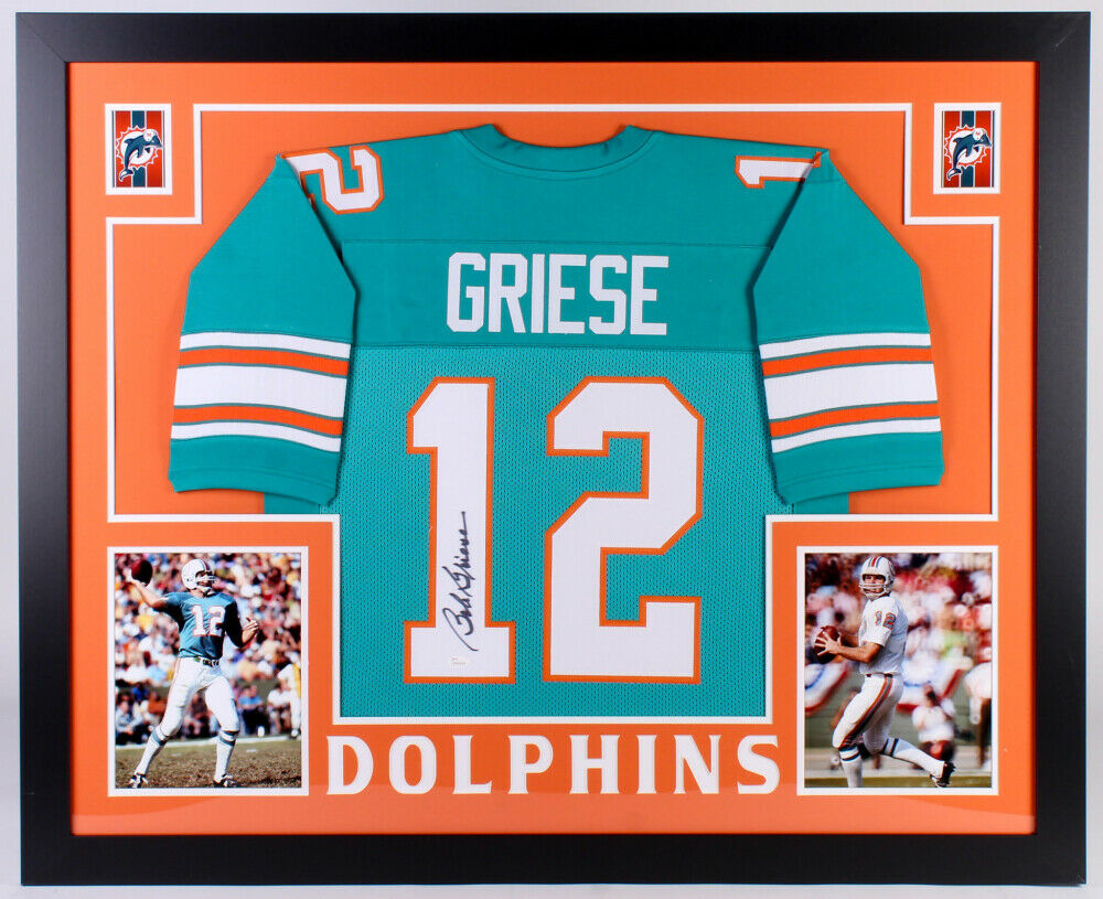 Custom frame measures approximately 35" x 43" in size and features a jersey which has been hand-signed in black felt-tip pen by Bob Griese. The lot / autograph(s) includes an official James Spence Authentication (JSA) hologram and matching COA for authenticity purposes. The signing of this item was witnessed by JSA.Authentication: JSA COA
