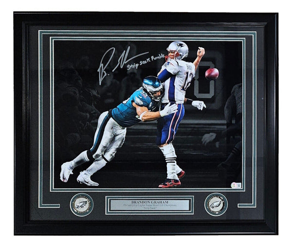 Featured is a Brandon Graham signed 16x20 Philadelphia Eagles photo, inscribed "Strip Sack Fumble". This photo has been hand signed by Graham and comes with the Beckett hologram and certificate of authenticity. This photo has been professionally framed and matted and is approximately 22x27. This photo would make a great addition to any sports memorabilia collection! SPECIFICATIONS Autographed By: Brandon Graham Team: Philadelphia Eagles Sport: Football Authentication: Beckett Grading Services