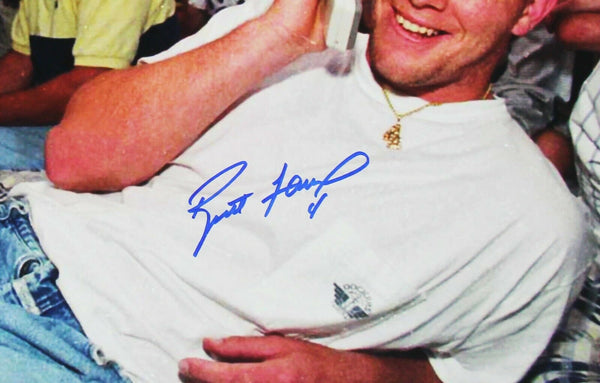 A Green Bay Packers Unframed 16x20 NFL Photo - Draft Day Call hand signed by Brett Favre. The item and signature are in excellent condition. A 20 year veteran of the NFL, Brett is a Super Bowl Champion, 11x Pro Bowler, 3x AP NFL Most Valuable Player, 4x NFL passing touchdowns leader, and 2x passing yards leader. His number, 4, has been retired by both the Green Bay Packers and the Southern Miss Golden Eagles. Brett was inducted into the Pro Football Hall of Fame in 2016. AUTHENTICATION: The item is accompanied by a Brett Favre Exclusive Certificate of Authenticity - Brett Favre Exclusive Serial Numbered and Databased Hologram - Picture of Brett from the signing