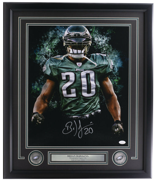 Featured is a Brian Dawkins Eagles signed and framed 16x20. This photo was hand signed by Brian Dawkins and authenticated by JSA authentication services. Included with the frame is a JSA hologram and certificate of authentication. This item would make a great addition to any sports memorabilia collection. SPECIFICATIONS Autographed By: Team: Philadelphia Eagles Sport: Football-NFL Authentication: James Spence Authentication (JSA)