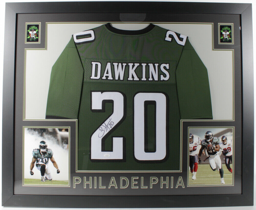 Custom frame measures approximately 35" x 43" in size and features a jersey that has been hand-signed by Brian Dawkins (HOF).The lot / autograph(s) includes an official Beckett Authentication Services serially-numbered hologram for authenticity purposes. The signing of this item was witnessed by Beckett.Authentication: Beckett Hologram