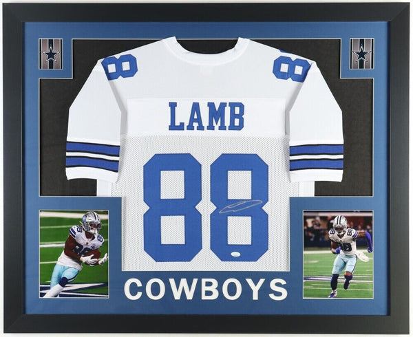 Custom framed display measures 35" x 43" in size. Features a jersey which has been hand-signed in silver paint pen by Ceedee Lamb. The autograph includes an official James Spence Authentication (JSA) hologram and matching COA for authenticity purposes. Authentication: JSA COA