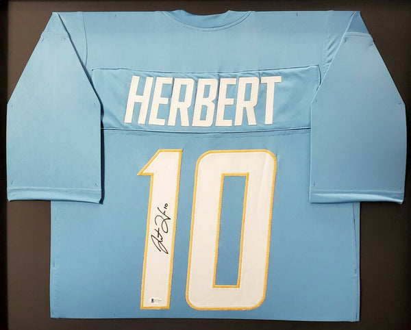 This is a framed Powder Blue Jersey, approximately 31x36 with the frame, that has been hand signed by Justin Herbert. This is a custom jersey with no name brand. The approximate size is XL. It has nice sewn in name and numbers. This item has been certified authentic by Beckett Authentication (BAS) and comes with their tamper-proof sticker and matching certificate of authenticity.