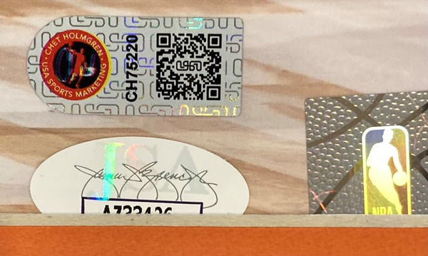 Featured is a Chet Holmgren signed 16x20 Oklahoma City Thunder photo, inscribed "2023-24", "1357 Pts", "648 Reb", and "190 Blk". This photo has been hand signed by Holmgren and comes with the JSA hologram and certificate of authenticity. This photo has been professionally framed and matted and is approximately 22x27. This photo would make a great addition to any sports memorabilia collection!. SPECIFICATIONS Autographed By: Chet Holmgren Team: Oklahoma City Thunder Sport: Basketball Authentication: James Spence Authentication (JSA)