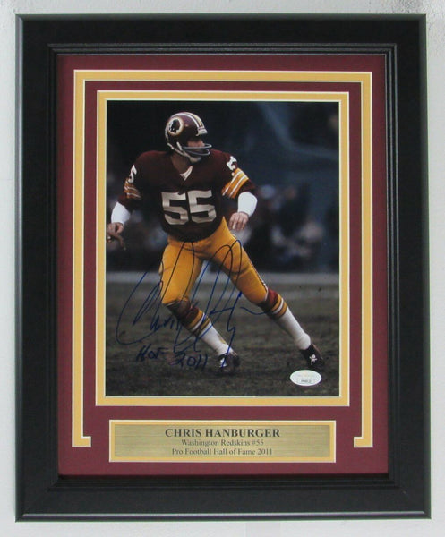 Chris hanburger hof washington redskins signed/autographed 8x10 photo framed. the outer frame size is 13 inches x 16 inches. this photo is authenticated by jsa and includes their tamper-proof sticker and certificate of authenticity.