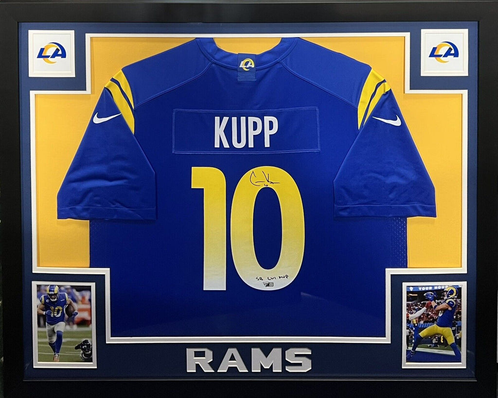 Super Bowl LVI MVP Cooper Kupp hand signed and inscribed SUPER BOWL MVP !! Rams Nike Game Jersey!! Beautiful Nike licensed Royal Blue Rams Game Jersey!! Beautiful mint autograph and inscription. Inscribed "SB LVI MVP"