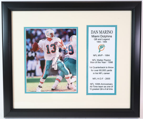 Capture a piece of football history with this authentic Dan Marino autographed 8x10 photo, a must-have for any Miami Dolphins fan. The photo, signed by the legendary player himself, comes with a deluxe frame that showcases it elegantly, making it a standout display piece for your home or office. The authenticity of the autograph is guaranteed by LSM COA, ensuring that you're receiving an original piece of sports memorabilia. Whether you're a dedicated collector or simply a passionate football enthusiast, this signed photo of one of the game's greats is an exceptional item to own.Frame measures 17.5"x20.5"