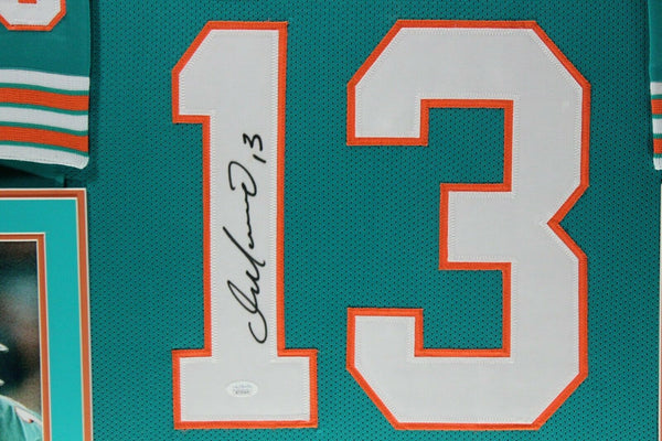 DAN MARINO AUTOGRAPHED & PROFESSIONALLY FRAMED PRO-STYLE JERSEY(Occasionally our own stock pictures are used at times due to quantity of framing, all frames will look identical as the one pictured)THE FRAMED JERSEY MEASURES 35"x 44" & COMES WITH THE FOLLOWING:-UV Protected Acrylic-Triple Acid Free Team Colored Matting-2 High Quality 8"x10" Photos-Team LogoEvery framed autographed jersey is accompanied with a tamper-proof hologram on the signed part of the jersey from one of the main authenticators in the industry (JSA, Beckett, PSA, etc.) and can be verified on their corresponding websites to prove authenticity.