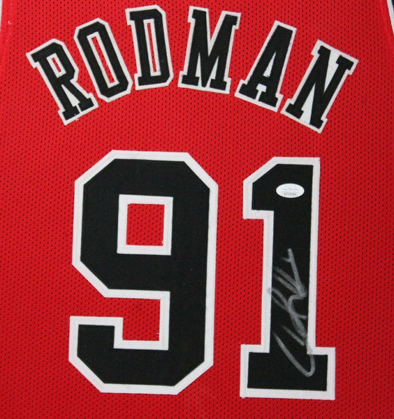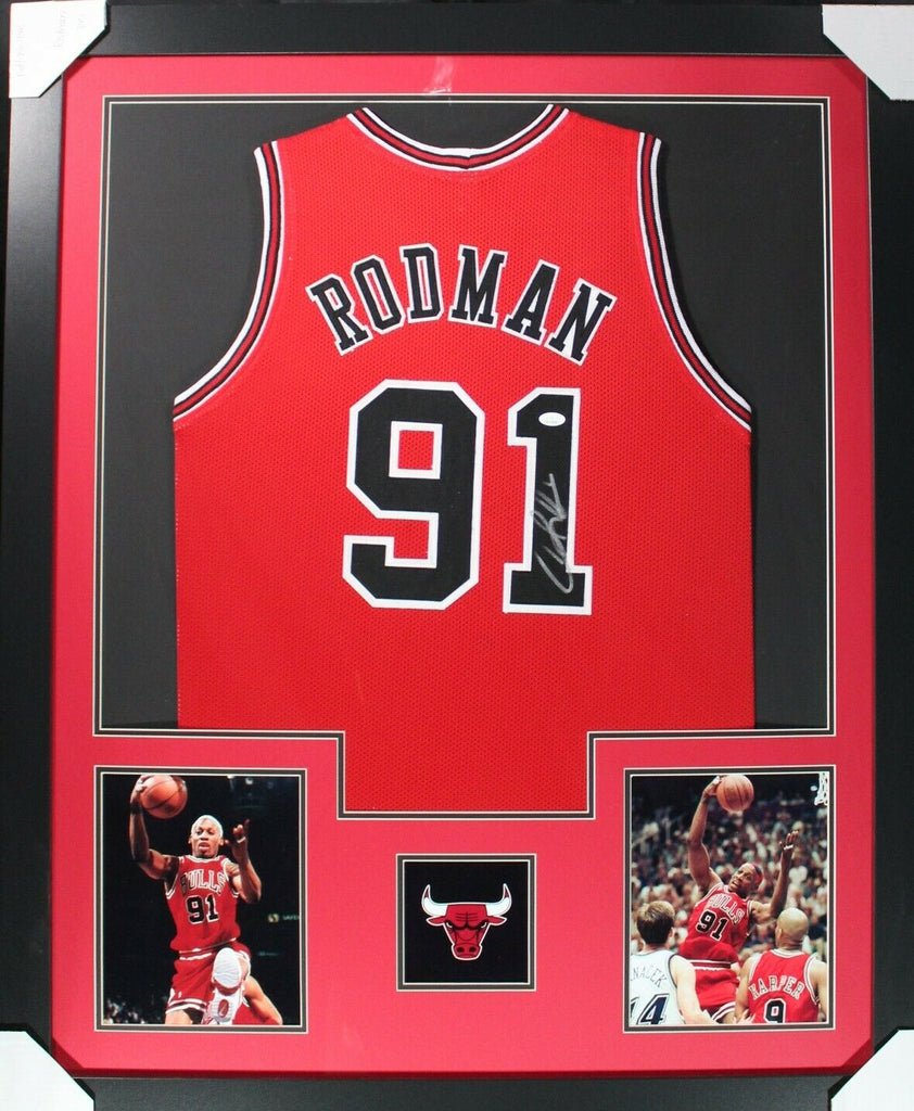 DENNIS RODMAN AUTOGRAPHED & PROFESSIONALLY FRAMED PRO-STYLE JERSEY(Occasionally our own stock pictures are used at times due to quantity of framing, all frames will look identical as the one pictured)THE FRAMED JERSEY MEASURES 35"x 44" & COMES WITH THE FOLLOWING:-UV Protected Acrylic-Triple Acid Free Team Colored Matting-2 High Quality 8"x10" Photos-Team LogoEvery framed autographed jersey is accompanied with a tamper-proof hologram on the signed part of the jersey from one of the main authenticators in the industry (JSA, Beckett, PSA, etc.) and can be verified on their corresponding websites to prove authenticity.