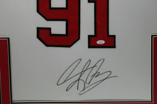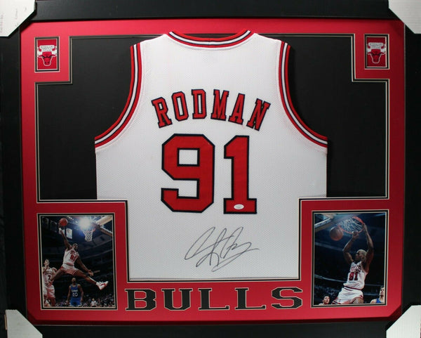 DENNIS RODMAN AUTOGRAPHED & PROFESSIONALLY FRAMED PRO-STYLE JERSEY(Occasionally our own stock pictures are used at times due to quantity of framing, all frames will look identical as the one pictured)Item is accompanied with a Certificate of Authenticity issued by JSA and corresponding tamper proof hologram on the jersey.THE FRAMED JERSEY MEASURES 35"x 44" & COMES WITH THE FOLLOWING:-UV Protected Acrylic-Triple Acid Free Team Colored Matting-2 High Quality 8"x10" Photos-Team Logo