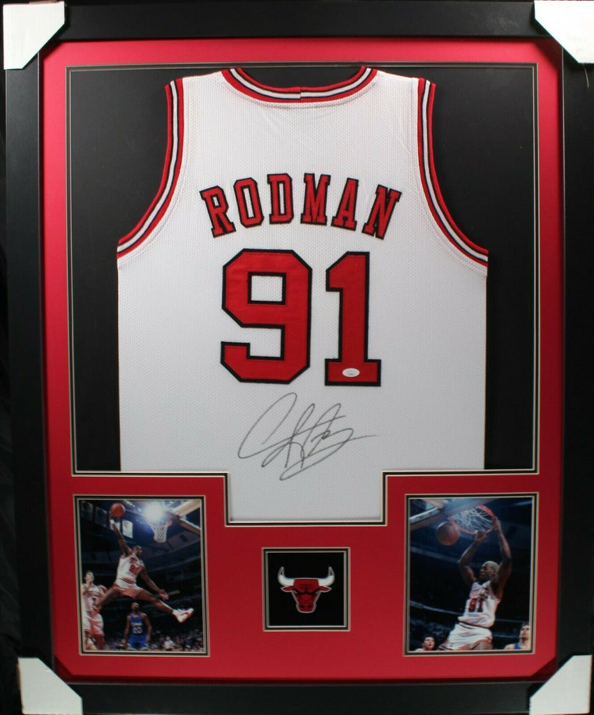 DENNIS RODMAN AUTOGRAPHED & PROFESSIONALLY FRAMED PRO-STYLE JERSEY(Occasionally our own stock pictures are used at times due to quantity of framing, all frames will look identical as the one pictured)Item is accompanied with a Certificate of Authenticity issued by JSA and corresponding tamper proof hologram on the jersey.THE FRAMED JERSEY MEASURES 35"x 44" & COMES WITH THE FOLLOWING:-UV Protected Acrylic-Triple Acid Free Team Colored Matting-2 High Quality 8"x10" Photos-Team Logo