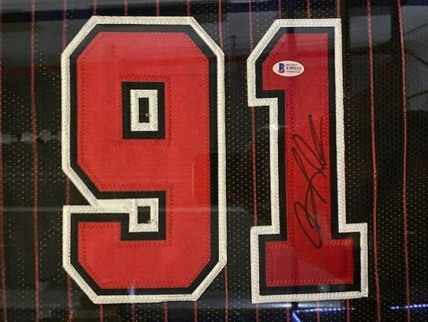 Custom frame measures approximately 35" x 43" in size and features a jersey which has been hand-signed in black felt-tip pen by Dennis Rodman. The lot / autograph(s) includes an official Beckett Authentication (JSA) hologram for authenticity purposes. The signing of this item was witnessed by Beckett.Authentication: Beckett Hologram