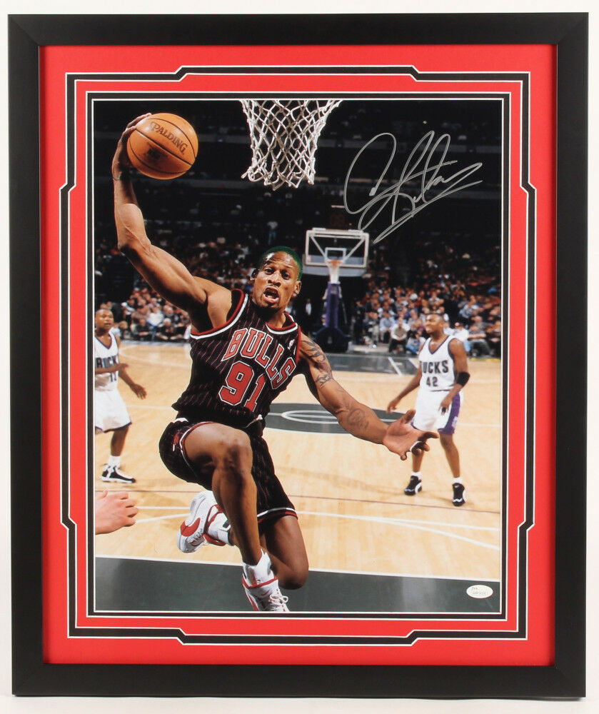 Custom framed photo display measures 22" x 26" in size. Hand-signed in silver paint pen by Dennis Rodman (HOF). The lot / autograph(s) includes an official James Spence Authentication (JSA) hologram and matching COA for authenticity purposes. The signing of this item was witnessed by JSA.Authentication: JSA COA