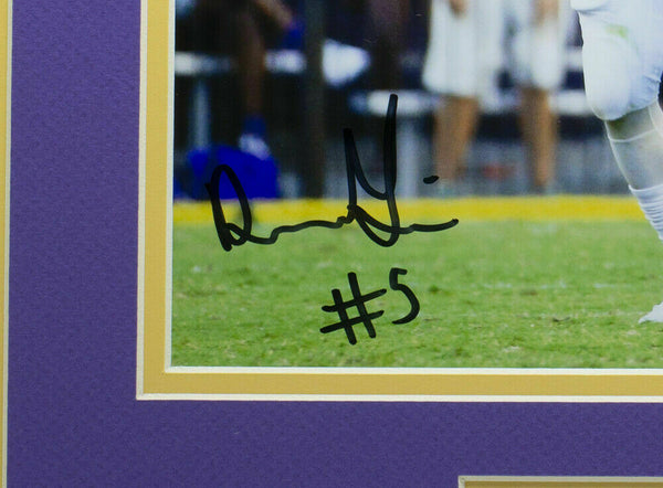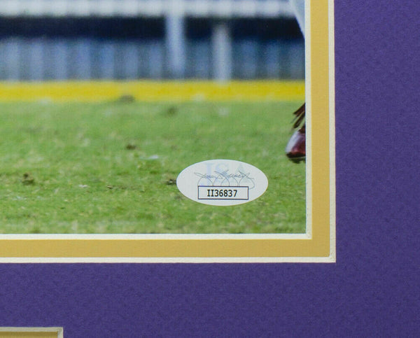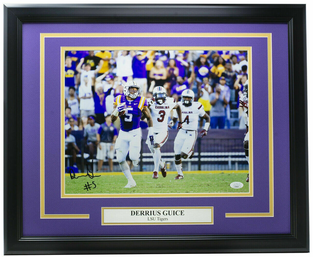 Featured is a Derrius Guice signed framed LSU Tigers 11x14 football photo. This photo was hand signed by Derrius Guice and authenticated by JSA authentication services. Included with the photo is a JSA hologram and certificate of authentication. Brand new professional framing featuring double matting and an engraved nameplate. The frame measures approximately 16x20 in total size, and it is ready for display. This item would make a great addition to any sports memorabilia collection.. SPECIFICATIONS Autographed By: Derrius Guice Team: LSU Tigers Sport: Football-NFL Authentication: James Spence Authentication (JSA)