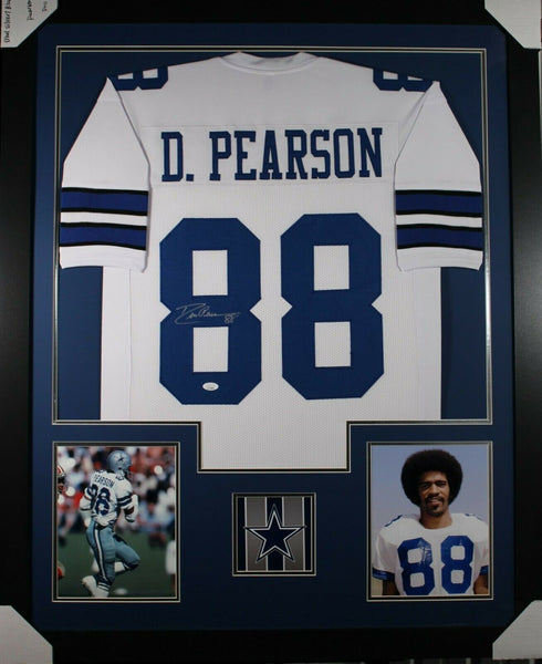 DREW PEARSON AUTOGRAPHED & PROFESSIONALLY FRAMED PRO-STYLE JERSEY(Occasionally our own stock pictures are used at times due to quantity of framing, all frames will look identical as the one pictured)Every framed autographed jersey is accompanied with a tamper-proof hologram on the signed part of the jersey from one of the main authenticators in the industry (JSA, Beckett, PSA, etc.) and can be verified on their corresponding websites to prove authenticity.THE FRAMED JERSEY MEASURES 35"x 44" & COMES WITH THE FOLLOWING:-UV Protected Acrylic-Triple Acid Free Team Colored Matting-2 High Quality 8"x10" Photos-Team Logo