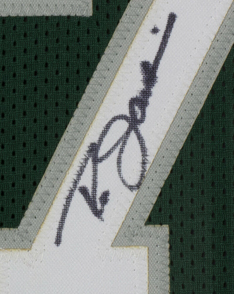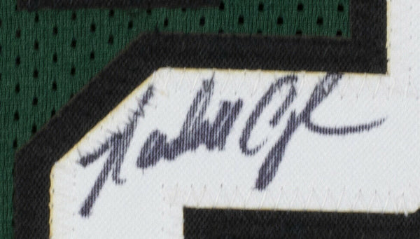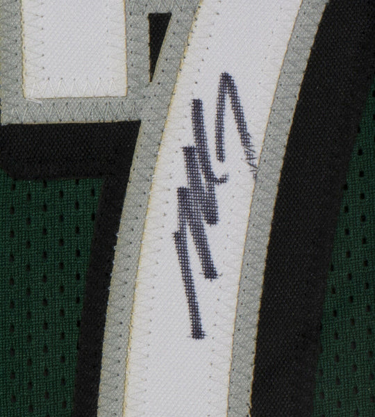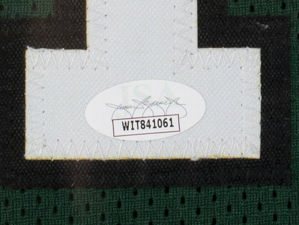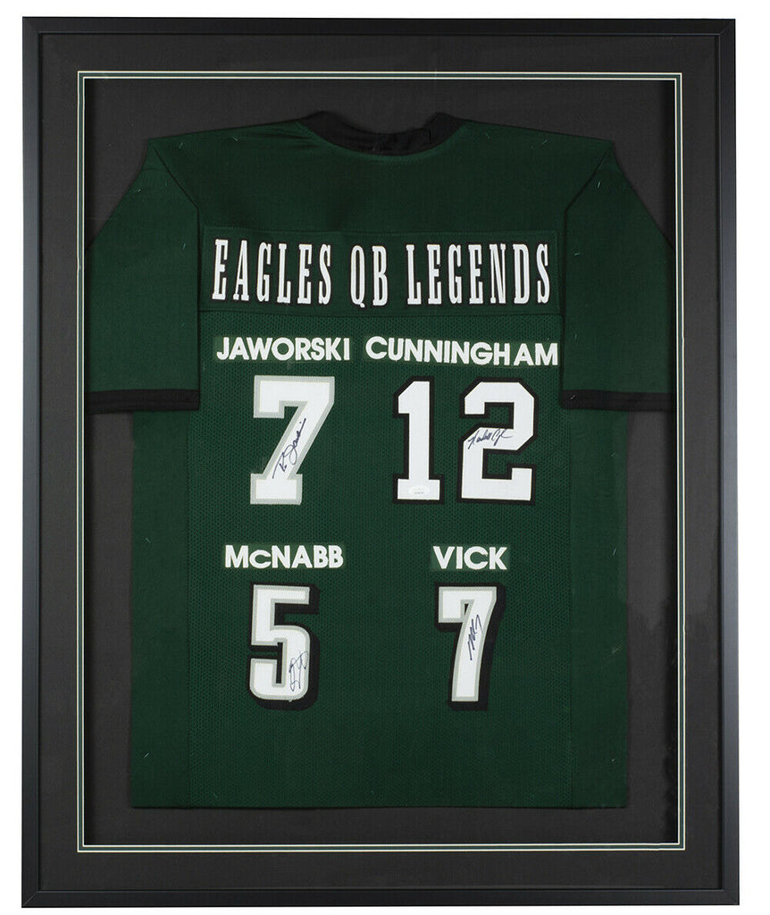 Featured is an Eagles QB Legends Michael Vick Donovan McNabb Ron Jaworski Randall Cunningham signed framed custom green football jersey. This jersey was hand signed in the presence of a JSA authentication representative. Included with the jersey is a Beckett hologram and certificate of authentication. This jersey would make a great addition to any sports memorabilia collection. This jersey has hand sewn numbers and letter and has NO logos or any affiliation with any manufacturer or team. It is simply intended as an autographed collectible. SPECIFICATIONS Autographed By: Michael Vick Team: Philadelphia Eagles Sport: Football-NFL Authentication: James Spence Authentication (JSA)