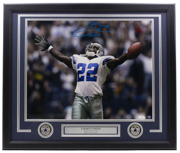 Featured is a Emmitt Smith signed framed 16x20 Dallas Cowboys football photo. This photo was hand signed by Emmitt Smith and has been authenticated by JSA authentication services. Included with the photo is a JSA hologram and certificate of authenticity. This photo has been professionally framed and matted and measures approximately 22x27. SPECIFICATIONS Autographed By: Emmitt Smith Team: Dallas Cowboys Sport: Football Authentication: James Spence Authentication (JSA)