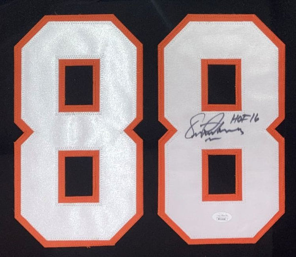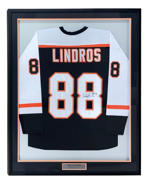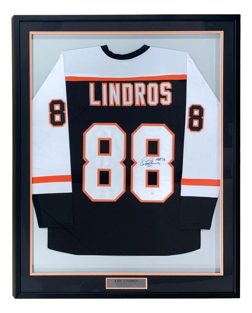 Featured is an Eric Lindros signed custom hockey jersey, inscribed "HOF 16" . This jersey has been hand signed by Lindros and comes with the JSA hologram and certificate of authenticity. This jersey features professionally sewn letters and numbers and is size XL. This jersey has no team tags or emblems and is intended as a sports collectible. This jersey has been professionally framed and matted and is approximately 32x42. This item would make a great addition to any sports memorabilia collection!. SPECIFICATIONS Autographed By: Eric Lindros Team: Philadelphia Flyers Sport: Hockey Authentication: James Spence Authentication (JSA)