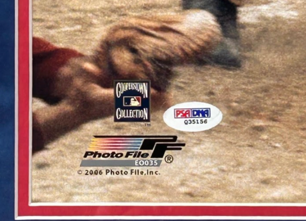 Own a Piece of Baseball History This stunning 16x20 photograph features the legendary Ernie Banks with his authentic autograph and special 'HOF 77' inscription, commemorating his Hall of Fame induction in 1977. Known as 'Mr. Cub,' Banks was one of baseball's most beloved players and the first African American to play for the Chicago Cubs. Premium Presentation * Professionally framed in a deluxe 28"W x 30"H frame * High-quality 16x20 photograph showcasing Banks in action * Hand-signed autograph with 'HOF 77' inscription * PSA/DNA Certificate of Authenticity included * Ready to display in your home, office, or sports memorabilia collection Authentication & Quality This collectible comes with PSA/DNA certification, the gold standard in sports memorabilia authentication. The certificate guarantees the authenticity of Ernie Banks' signature, giving you complete confidence in your investment. Perfect for Cubs fans, baseball collectors, or anyone who appreciates the legacy of one of the game's greatest ambassadors. This framed piece makes an exceptional gift and a centerpiece for any sports collection.