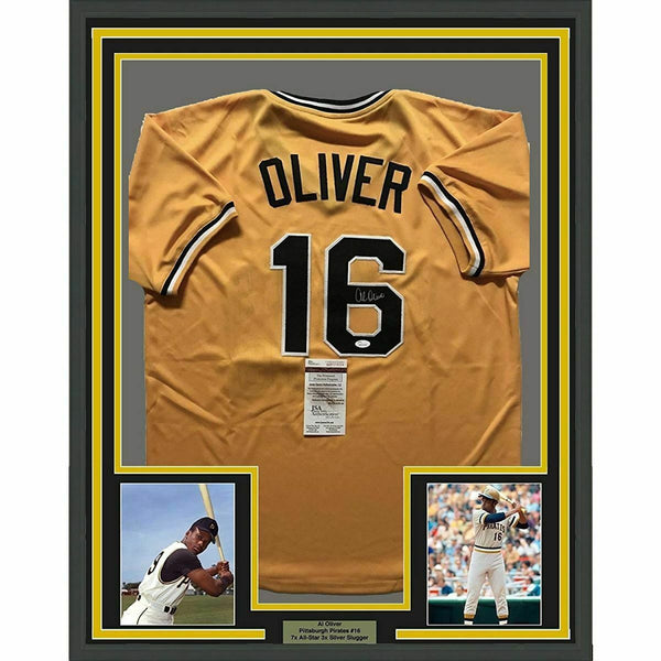 FRAMED Autographed/Signed AL OLIVER 33x42 Pittsburgh Yellow Jersey JSA COA Auto The item is professionally framed & matted with two 8x10 photos, measures 33"x42" and is ready to be hung in your man cave! NOTE: COA card will be mounted on the back of the frame, not inside it on top of the jersey as seen in the picture.