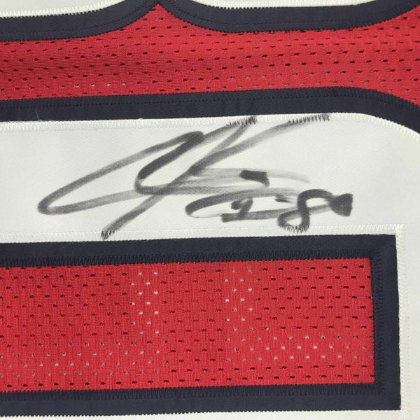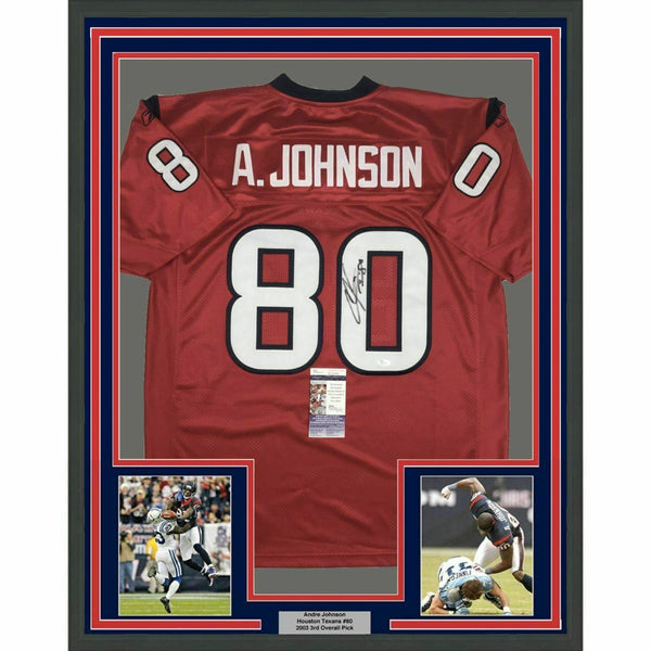 FRAMED Autographed/Signed ANDRE JOHNSON 33x42 Houston Red Jersey JSA COA Auto The item is professionally framed & matted with two 8x10 photos, measures 33"x42" and is ready to be hung in your man cave! NOTE: COA card will be mounted on the back of the frame, not inside it on top of the jersey as seen in the picture.