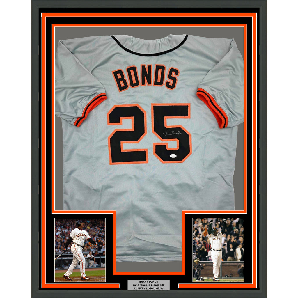 Framed Autographed/Signed Barry Bonds 35x39 San Francisco Grey Jersey JSA COA The item is professionally framed and matted with two 5x7 photos, measures 35x39 inches and is ready to be hung in your man cave! Photo and matting requests can be made.