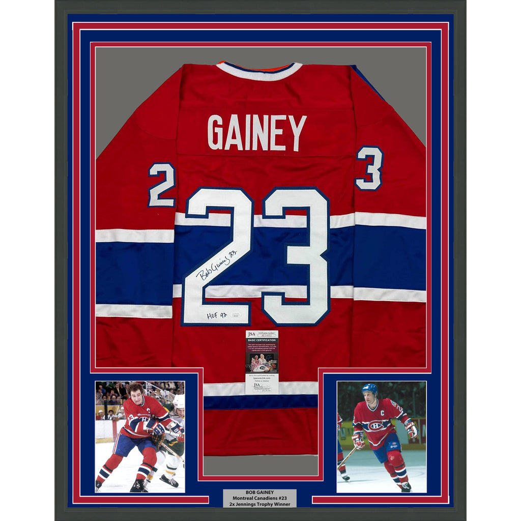 Framed Autographed/Signed Bob Gainey 35x39 HOF 1992 Montreal Red Jersey JSA COA The item is professionally framed and matted with two 5x7 photos, measures 35x39 inches and is ready to be hung in your man cave! Photo and matting requests can be made.