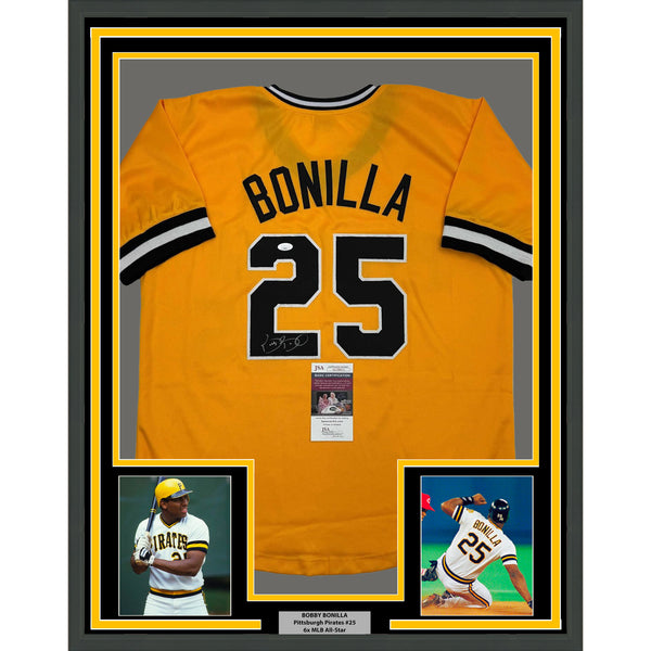 Framed Autographed/Signed Bobby Bonilla 35x39 Pittsburgh Yellow Jersey JSA COA The item is professionally framed and matted with two 5x7 photos, measures 35x39 inches and is ready to be hung in your man cave! Photo and matting requests can be made.